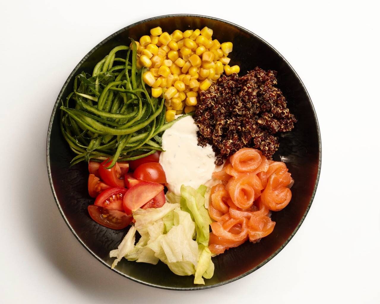 Новинка!300гслабосолений лосось, помідори чері, кукурудза, айсберг, огірок, кіноа, йогуртовий соусДодати в кошик 250₴